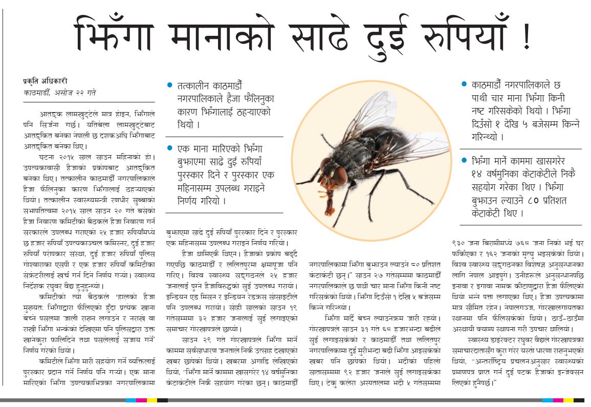 आतङ्क लामखुट्टेले मात्र होइन, झिँगाले पनि सिर्जना गर्छ । यतिबेला लामखुट्टेबाट आतङ्कित बनेका नेपाली छ दशकअघि झिँगाबाट आतङ्कित बनेका थिए ।
