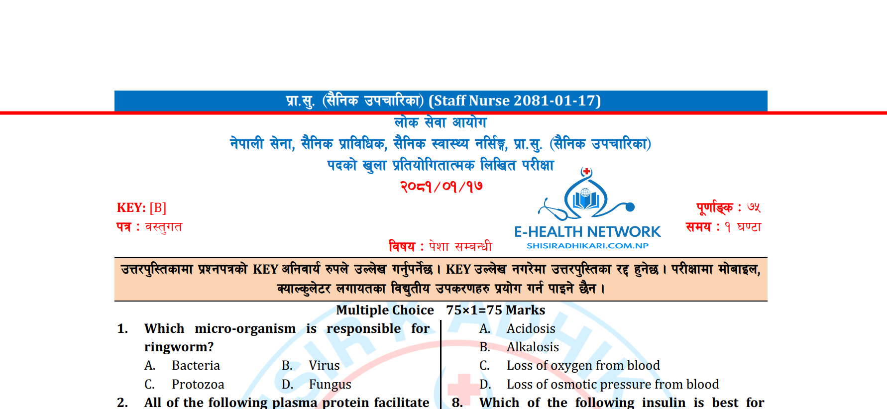 लोक सेवा आयोग || नेपाली सेना नर्सिङ्ग, प्रा.सु. (सैनिक उपचारिका - Staff Nurse) Solutions (2081-01-17)
