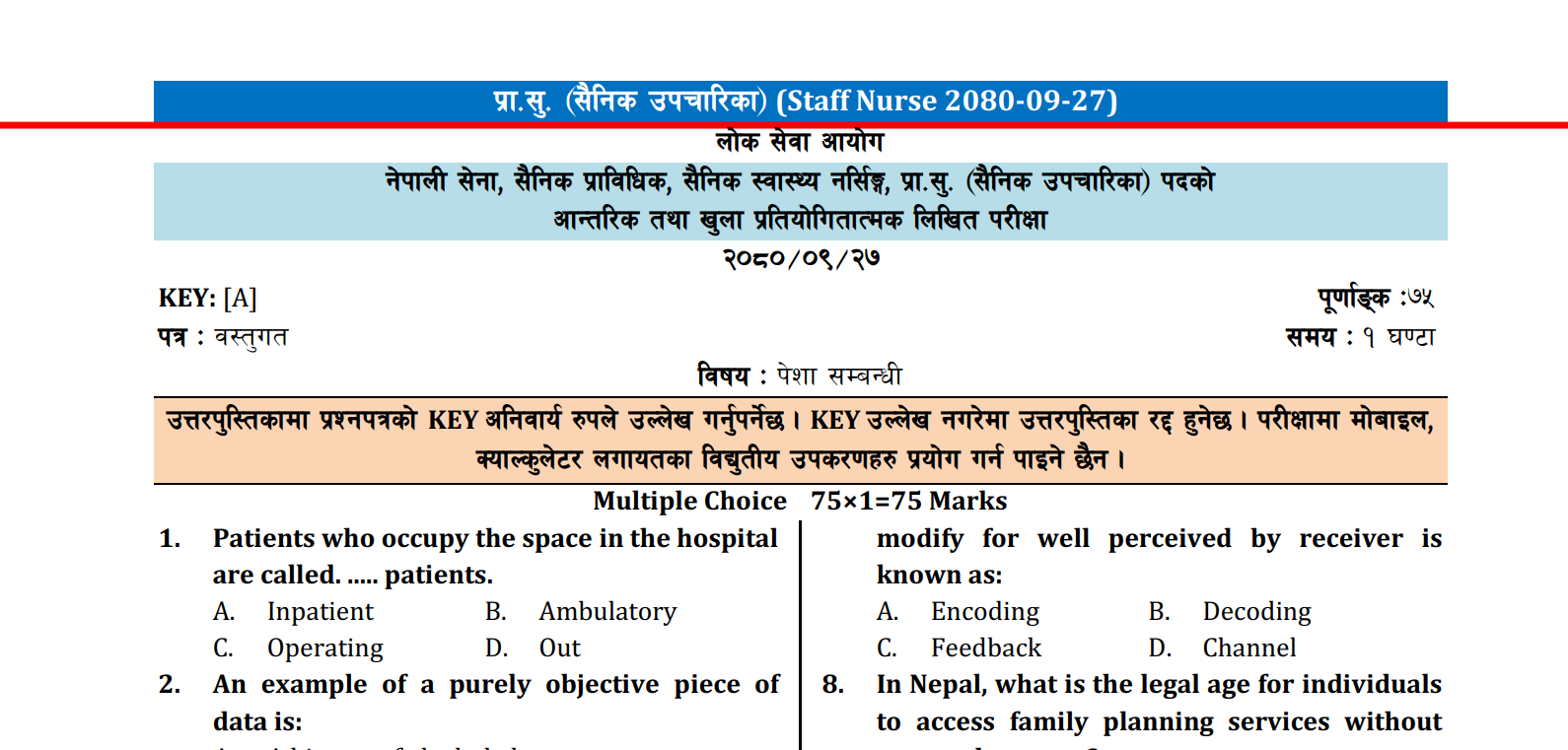 लोक सेवा आयोग || नेपाली सेना नर्सिङ्ग, प्रा.सु. (सैनिक उपचारिका - Staff Nurse) Solutions (2080-09-27)