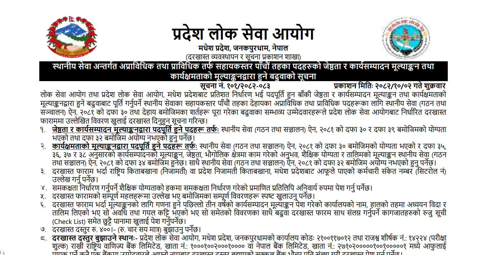मधेश प्रदेश लोक सेवा आयोगको स्थानीय सेवा अन्तर्गत पाँचौ तह (प्राविधिक/अप्राविधिक) विज्ञापन