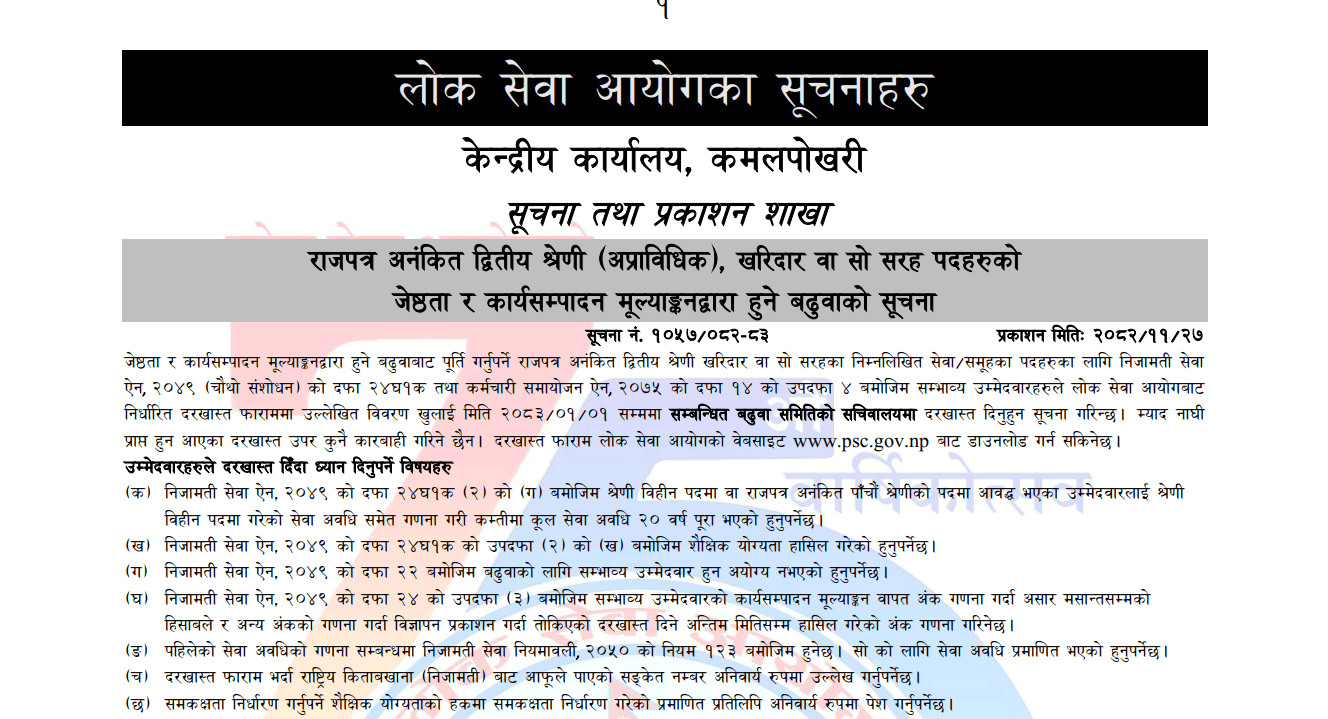 निजामती र संघीय संसद सेवाका रा.प.अनं. द्वितीय श्रेणी (अप्राविधिक), खरिदार वा सो सरह पदको बढुवा, आ.प्र. र खुला तथा समावेशीतर्फ विज्ञापन गरिएको सूचना।