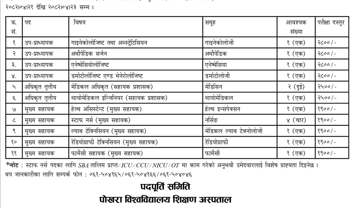 पोखरा विश्वविद्यालय शिक्षण अस्पतालको पदपूर्ति सम्बन्धी सूचना