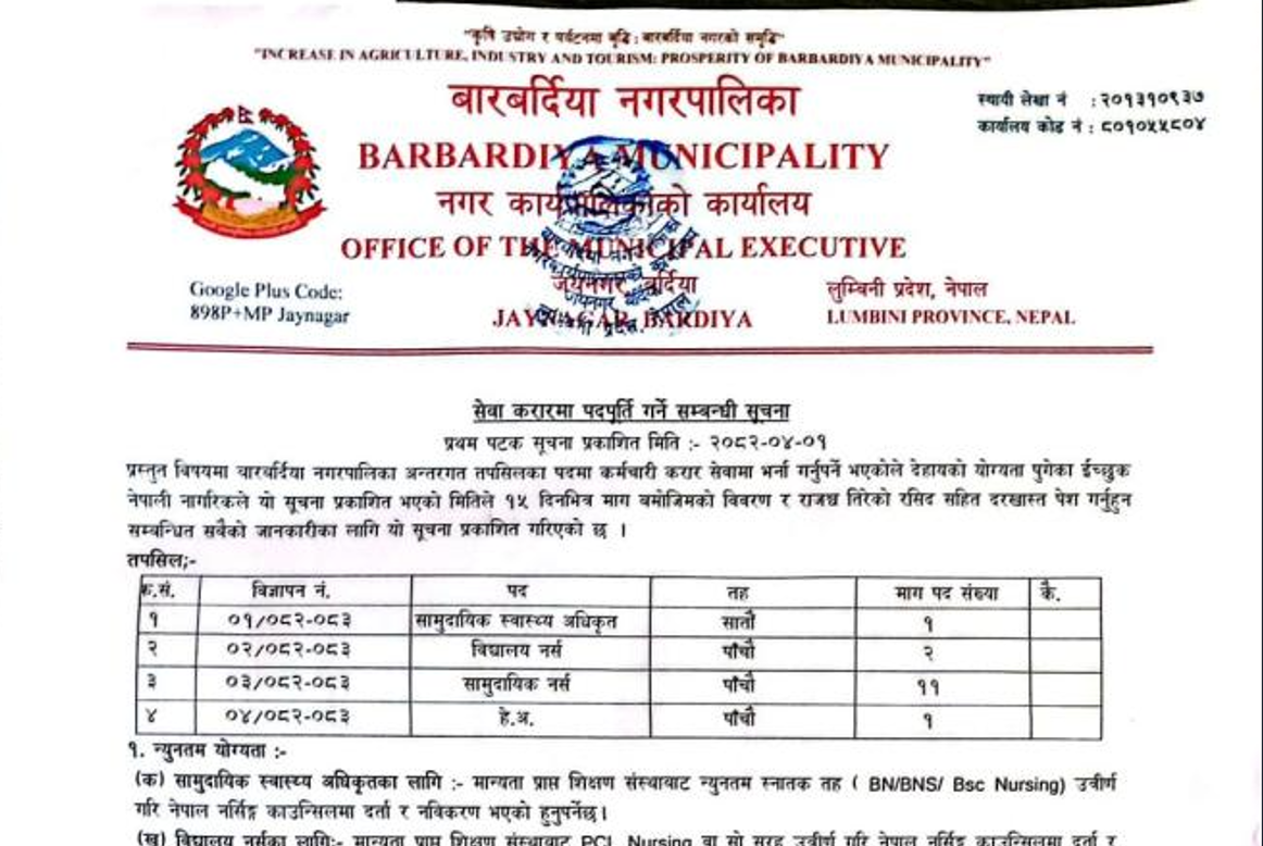 बारबर्दिया नगरपालिका बर्दियामा कर्मचारी आवश्यकता सम्बन्धी सूचना