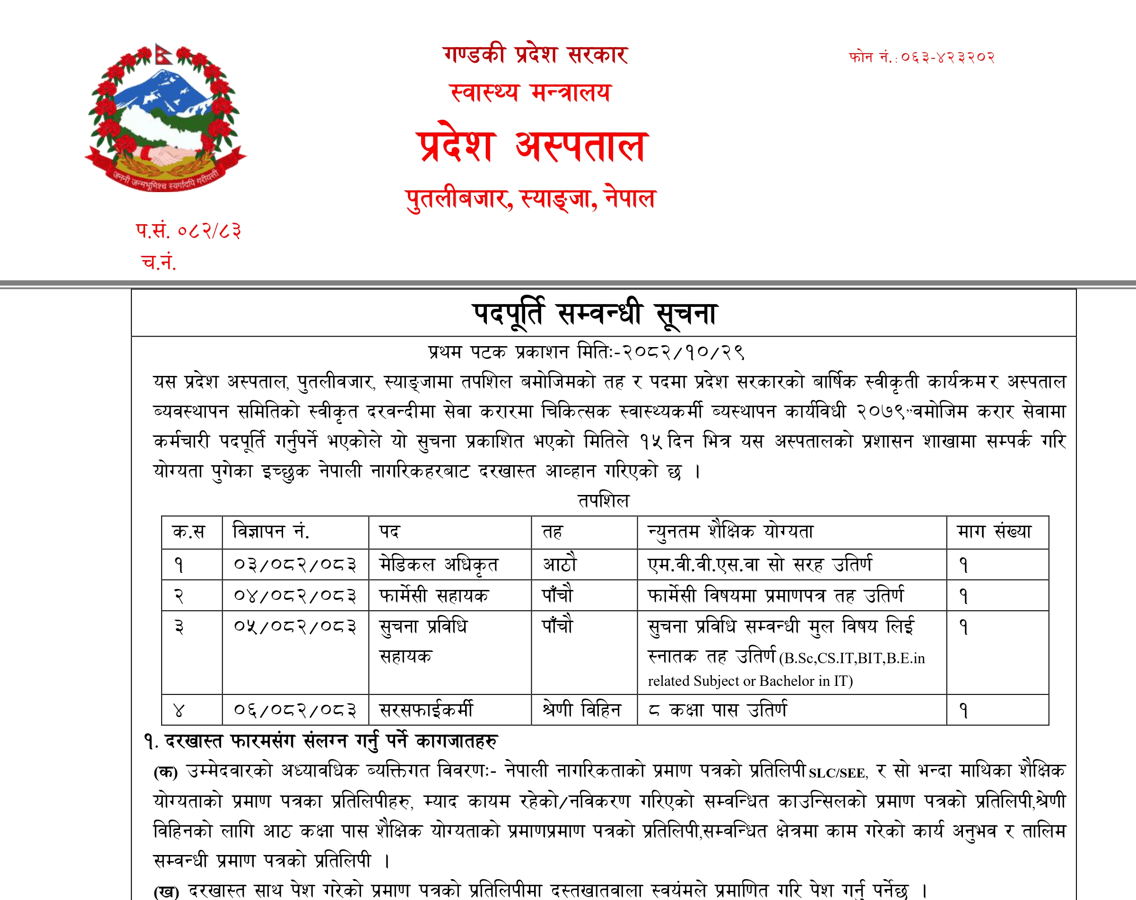 Province Hospital Syangja, Vacancies for Various Posts