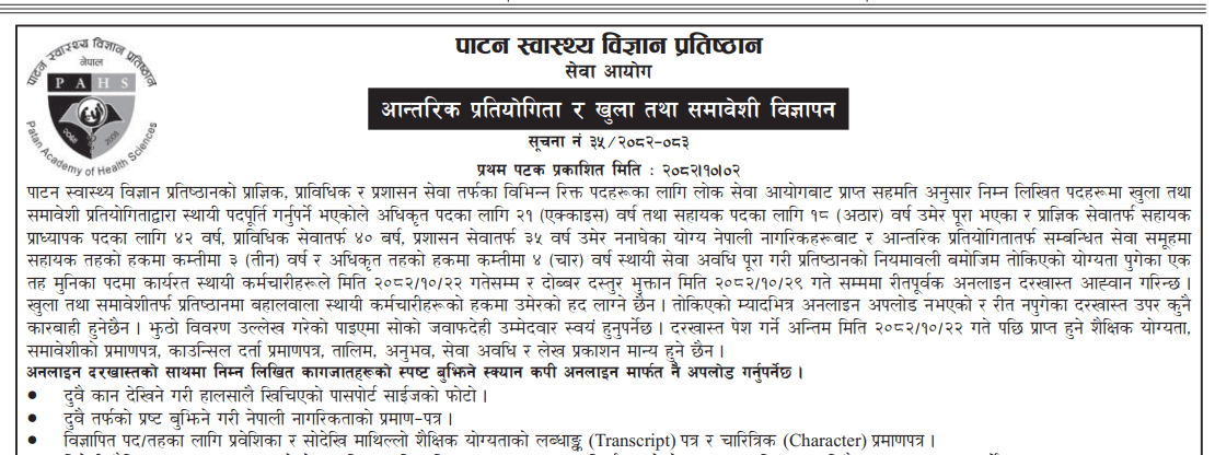 पाटन स्वास्थ्य विज्ञान प्रतिष्ठानमा कर्मचारी आवश्यकता सम्बन्धी सूचना