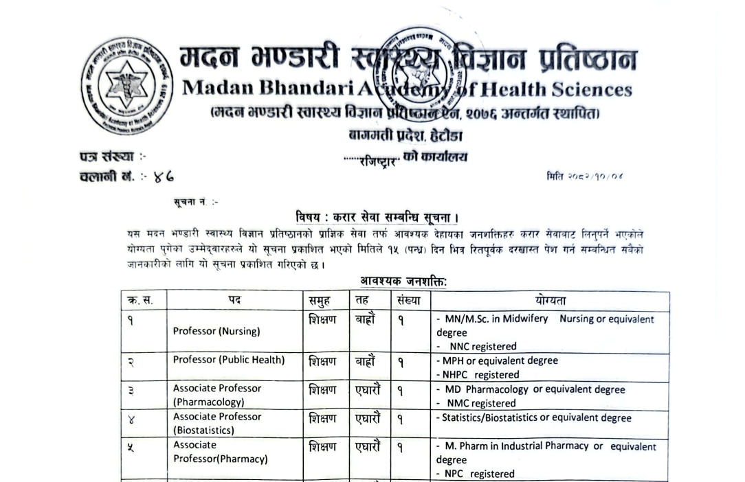 मदन भण्डारी स्वास्थ्य विज्ञान प्रतिष्ठानमा कर्मचारी आवश्यकता सम्बन्धी सूचना