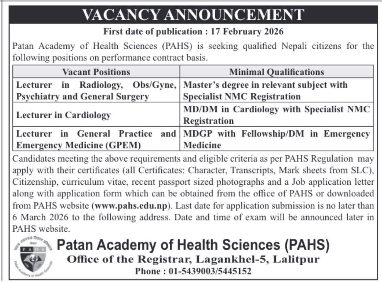 Patan Academy of Health Sciences (PAHS) Vacancies for Lecturer
