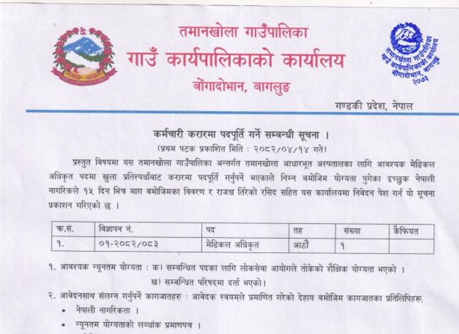 Tamankhola Rural Municipality Vacancy for Medical Officer