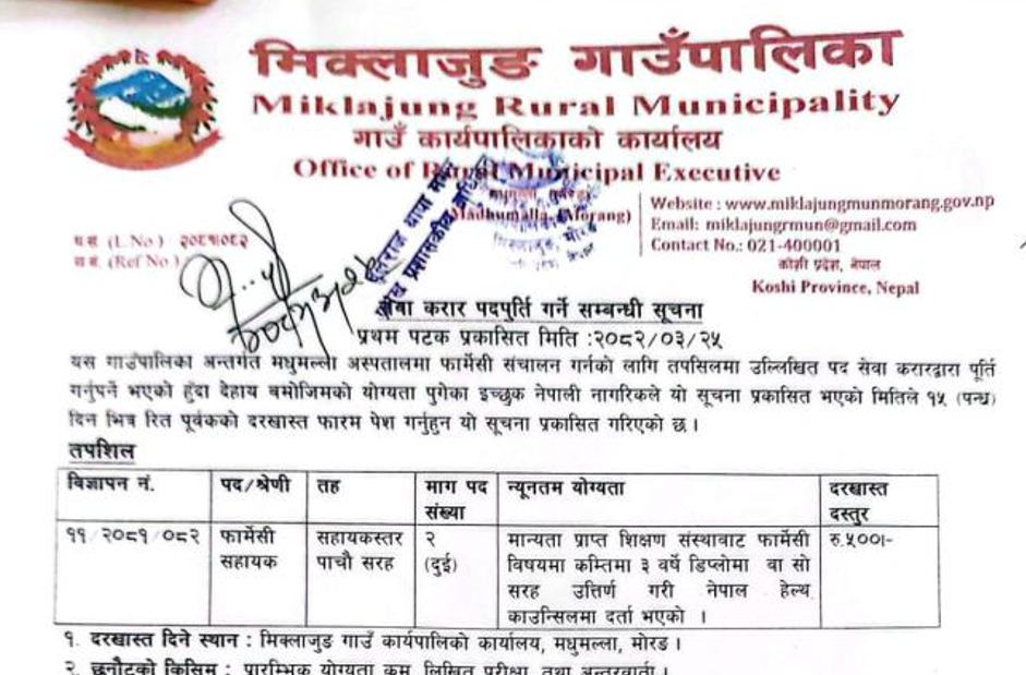 मिक्लाजुङ गाउँपालिकामा फार्मेशी सहायक आवश्यकता सम्बन्धी सूचना