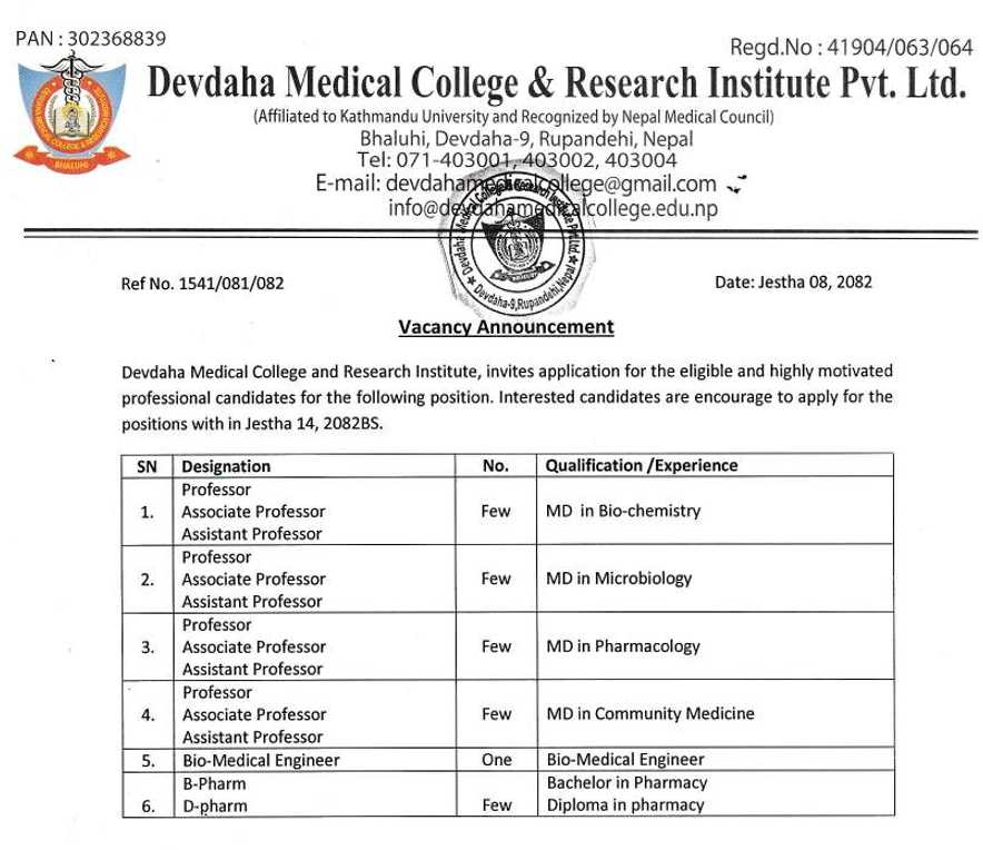 Devdaha Medical College & Research Institute Vacancy for Various Posts