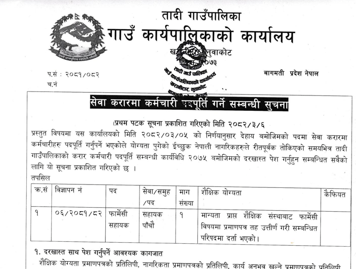 तादी गाउँपालिका खरानीटार नुवाकोटमा फार्मेसी सहायक आवश्यकता