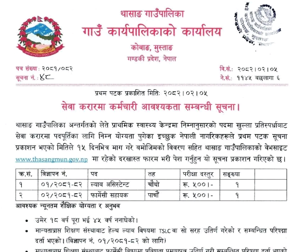 थासाङ गाउँपालिकामा सेवा करारमा कर्मचारी आवश्यकता सम्बन्धी सूचना ।