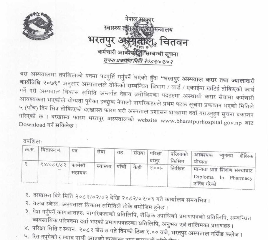 Bharatpur Hospital Vacancy for Pharmacy Assistant