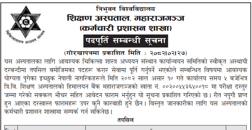शिक्षण अस्पताल महाराजगञ्जमा कर्मचारी आवश्यकता सम्बन्धी सूचना