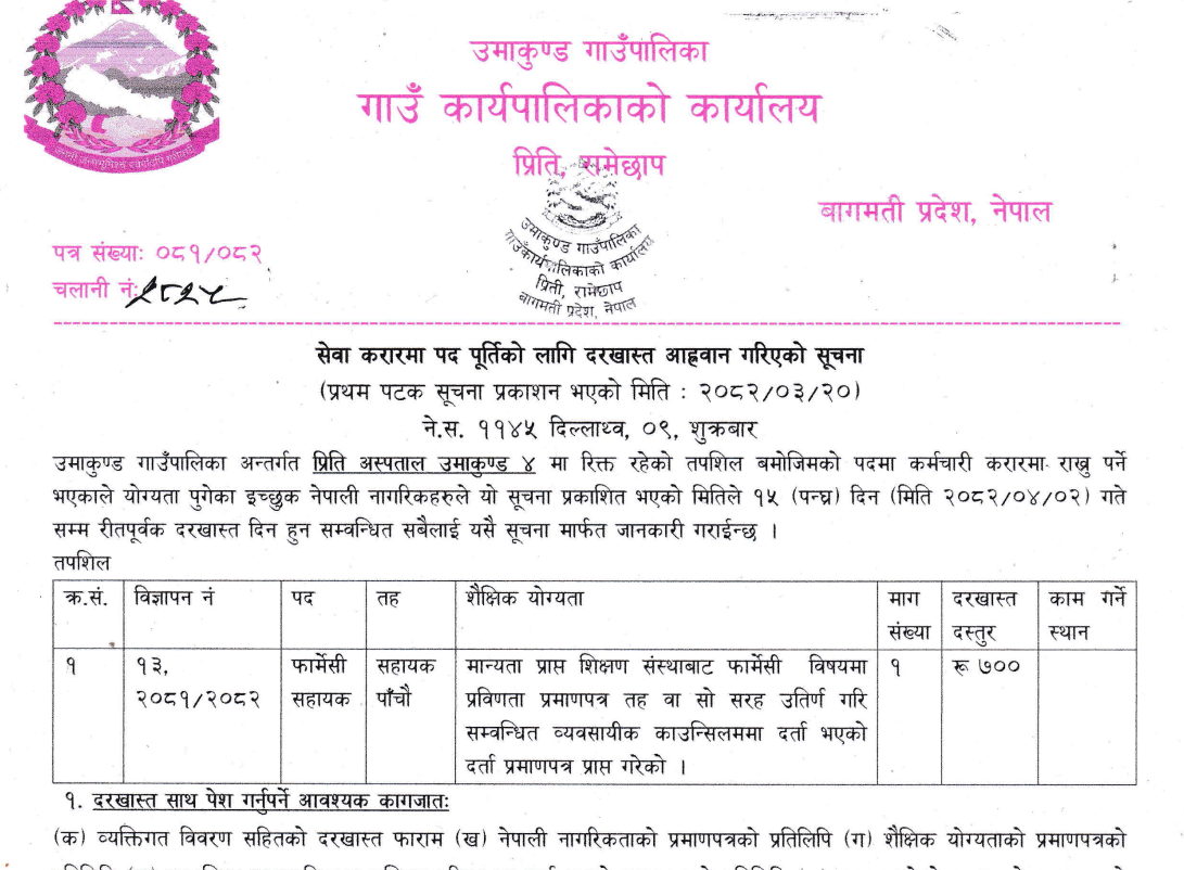 उमाकुण्ड गाउँपालिकामा सेवा करारमा फार्मेसी सहायक पद पूर्तिको लागि दरखास्त आह्वान