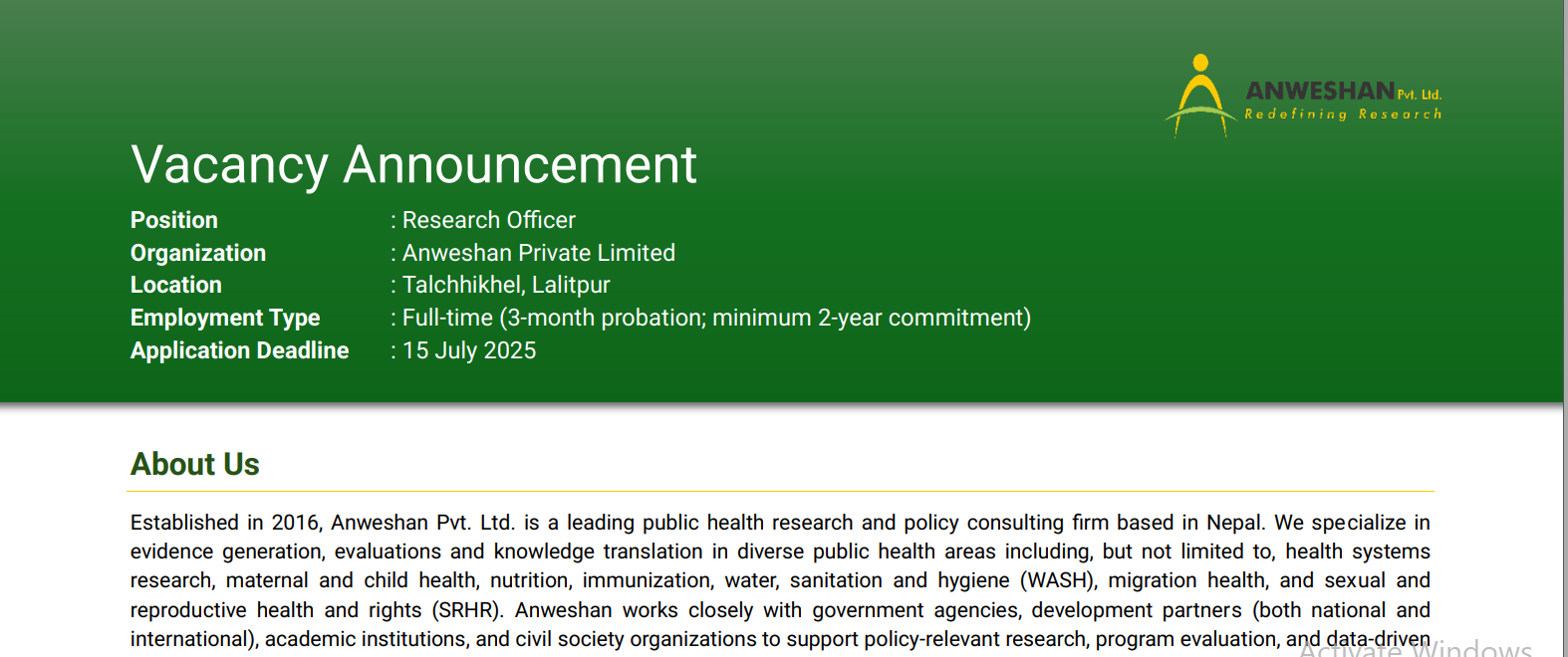 Anweshan Pvt. Ltd. Vacancy for Research Officer