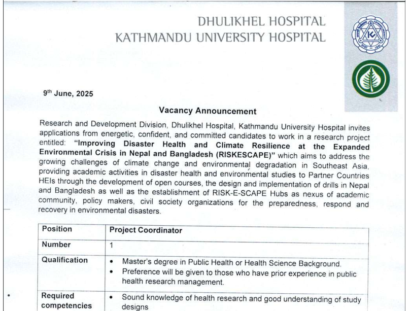 Dhulikhel Hospital Vacancies For The Post of Project Coordinator