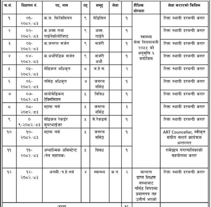 रामेछाप अस्पतालमा १६ जना कर्मचारी आवश्यकता