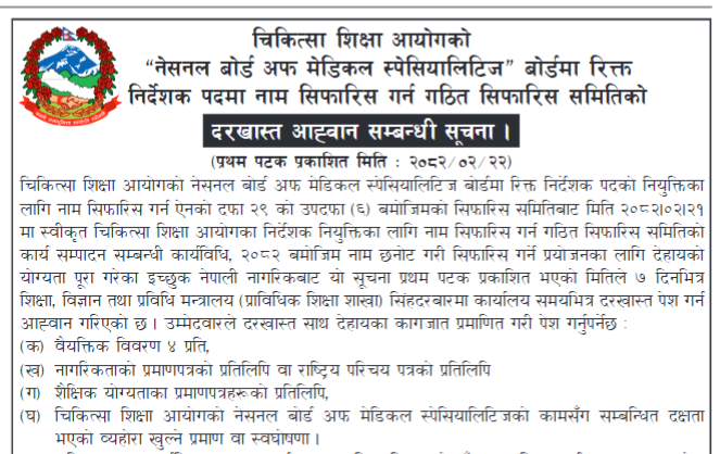 चिकित्सा शिक्षा आयोगको "नेसनल बोर्ड अफ मेडिकल स्पेसियालिटिज" बोर्डमा रिक्त निर्देशक पदमा दरखास्त आह्वान सम्बन्धी सूचना