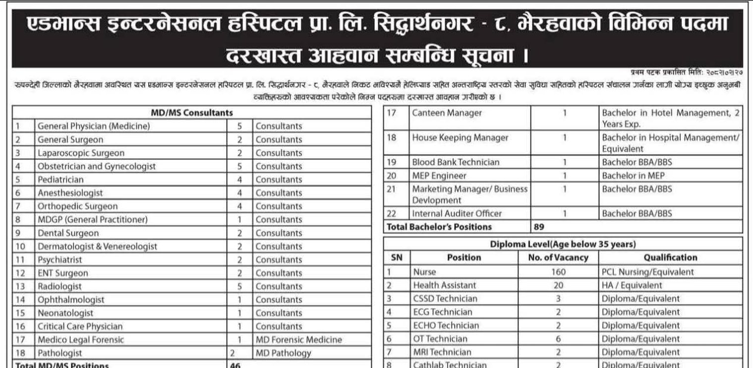 एडभान्स इन्टरनेशनल हस्पिटल भैरहवामा चिकित्सक, नर्स, पारमेडिक्स लगायत ५७२ कर्मचारी आवश्यकता
