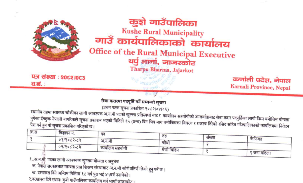 कुशे गाउँपालिका थर्पु भार्मा, जाजरकोटमा कर्मचारी आवश्यकता सम्बन्धी सूचना