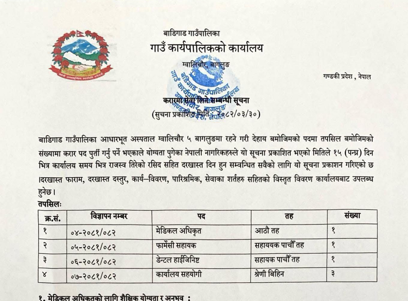 बडिगाड गाउँपालिकामा कर्मचारी आवश्यकता सम्बन्धी सूचना