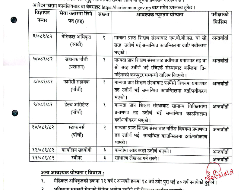 हरिवन नगरपालिकाको नगर अस्पतालको लागि कर्मचारी आवश्यकता
