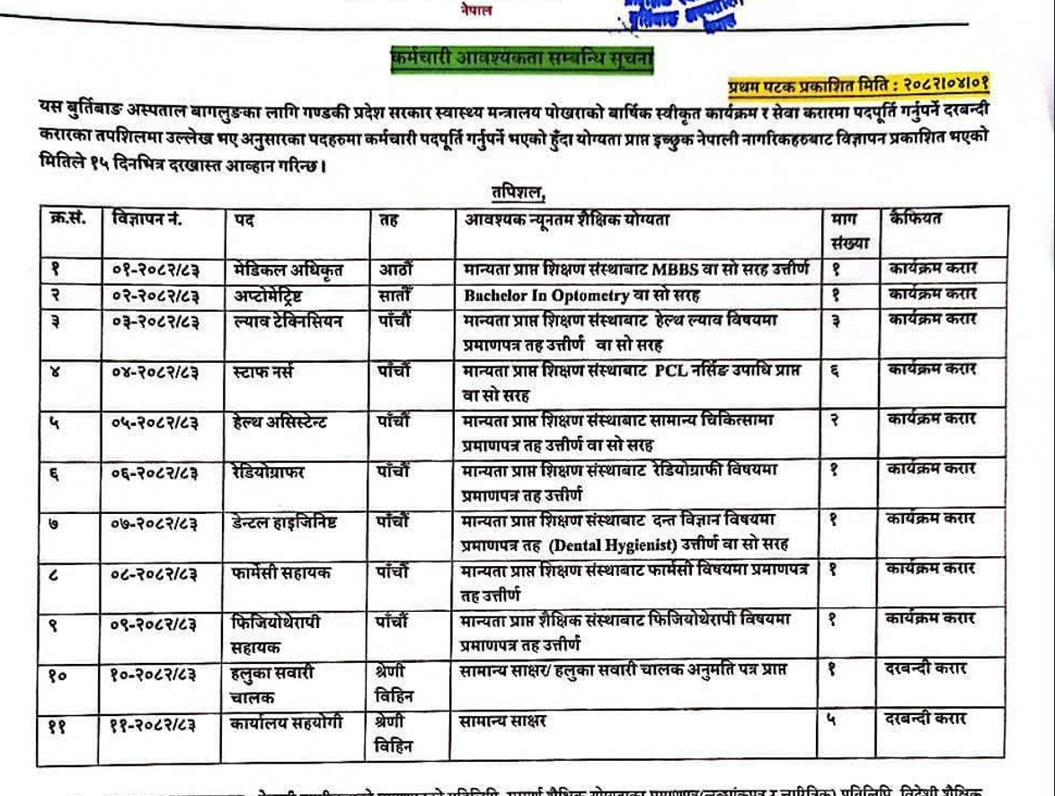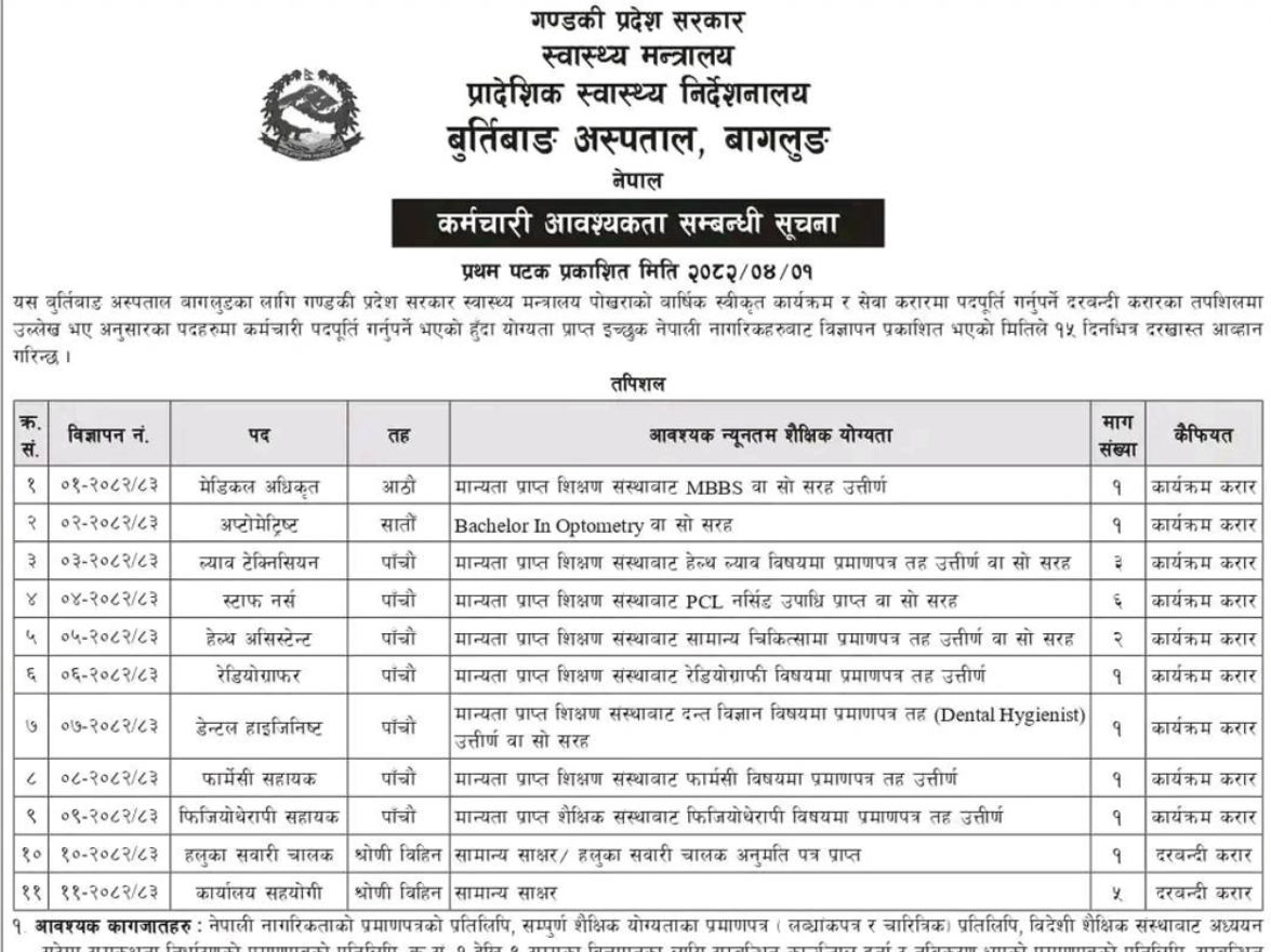 बुर्तिबाङ अस्पताल, बागलुङमा कर्मचारी आवश्यकता सम्बन्धी सूचना