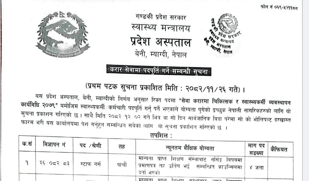Province Hospital Syangja, Vacancies for Various Posts