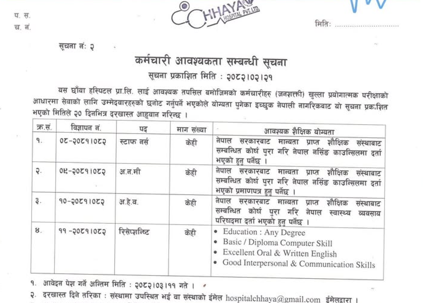 छायाँ हस्पिटल अर्घाखाँचीमा स्वास्थ्यकर्मी आवश्यकता सम्बन्धि सूचना !