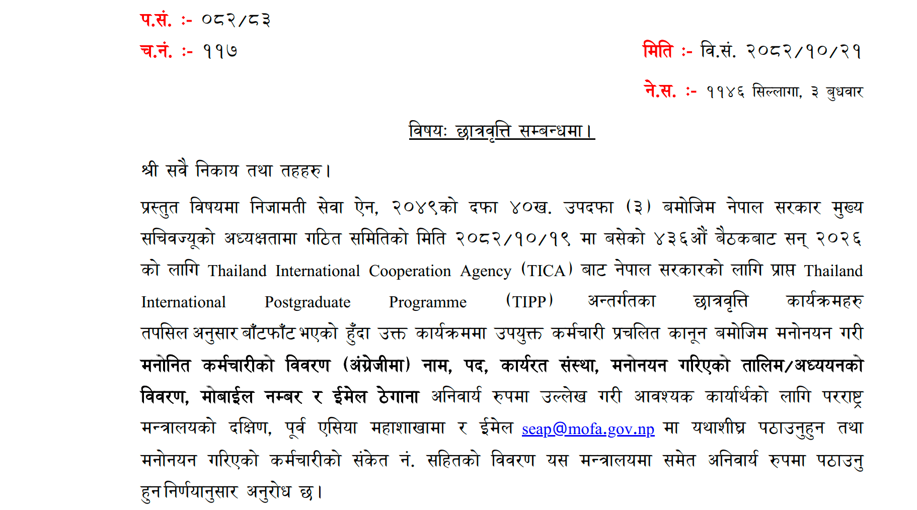 Notice from the MoFAGA for Application for Educational Incentive Scholarship for Children of Civil Servants