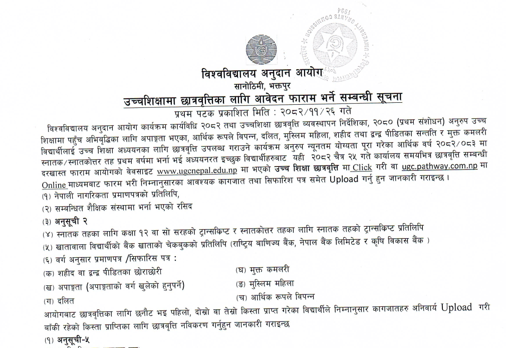 उच्च शिक्षामा छात्रवृत्तिका लागि आवेदन फारम भर्ने सम्बन्धी विश्वविद्यालय अनुदान आयोगको सूचना
