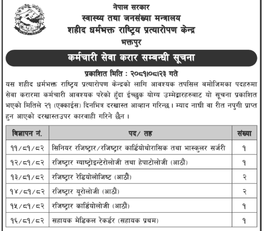 शहीद धर्मभक्त राष्ट्रिय प्रत्यारोपण केन्द्र भक्तपुरमा कर्मचारी सेवा करार र ट्रान्सप्लान्ट विषयमा Fellowship कार्यक्रममा भर्ना सम्बन्धी सूचना