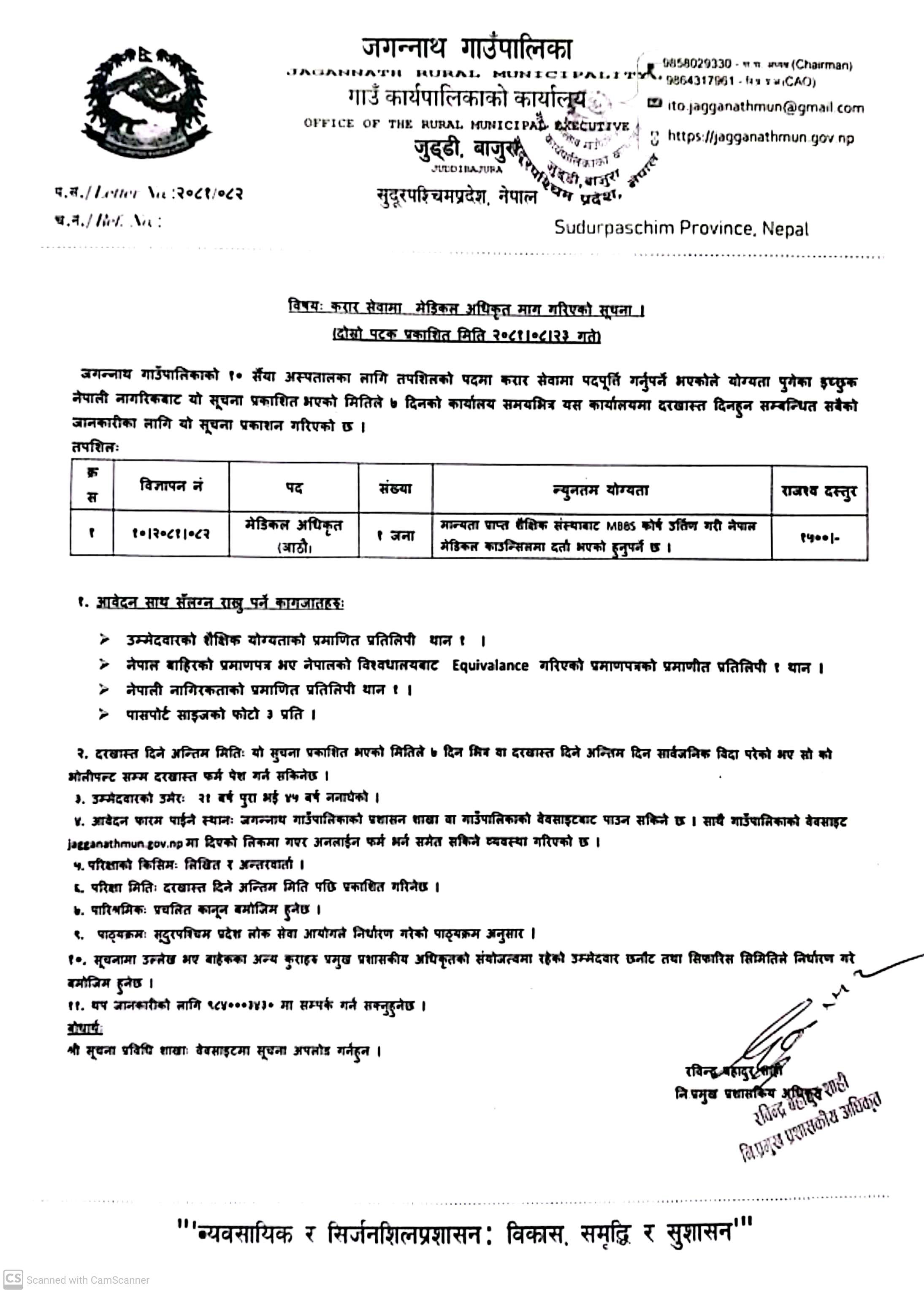 जगन्नाथ गाउँपालिका बाजुरामा मेडिकल अधिकृत आवश्यकता सम्बन्धी सूचना