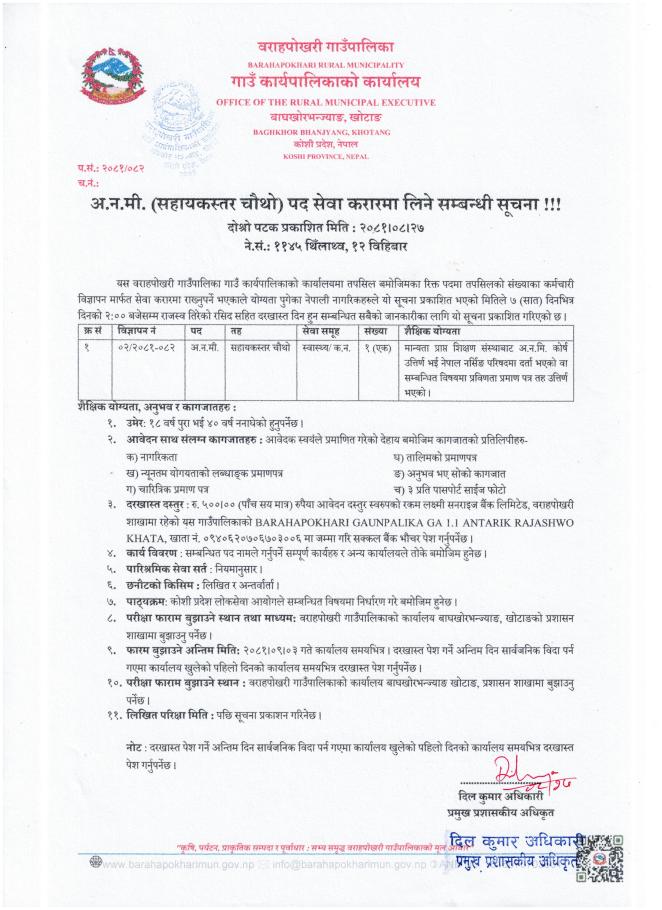 वराहपोखरी गाउँपालिकामा अ.न.मी. आवश्यकता सम्बन्धी सूचना
