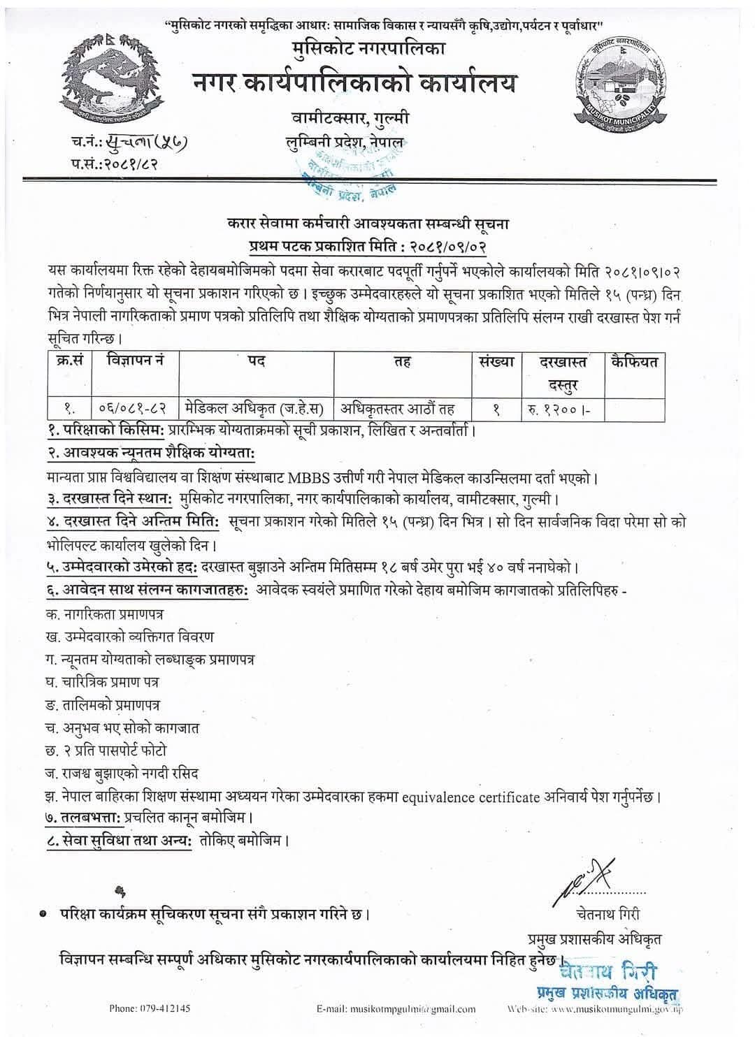 मुसिकोट नगरपालिका गुल्मीमा मे.अ. करारमा आवश्यकता सम्बन्धी सूचना