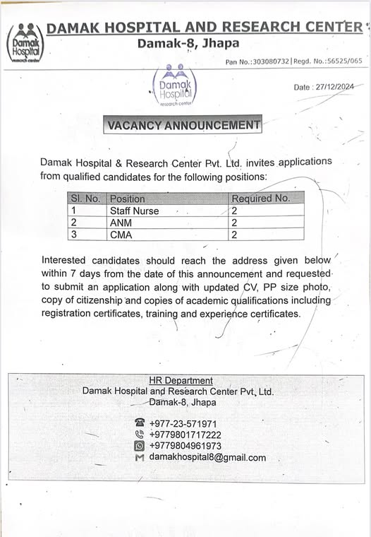 Vacancy Announcement at Damak Hospital & Research Center for SN, AHW and ANM
