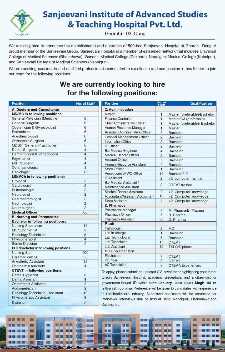 Vacancy Announcement at Sanjeevani Institute of Advanced Studies and Teaching Hospital Dang for Various Positions