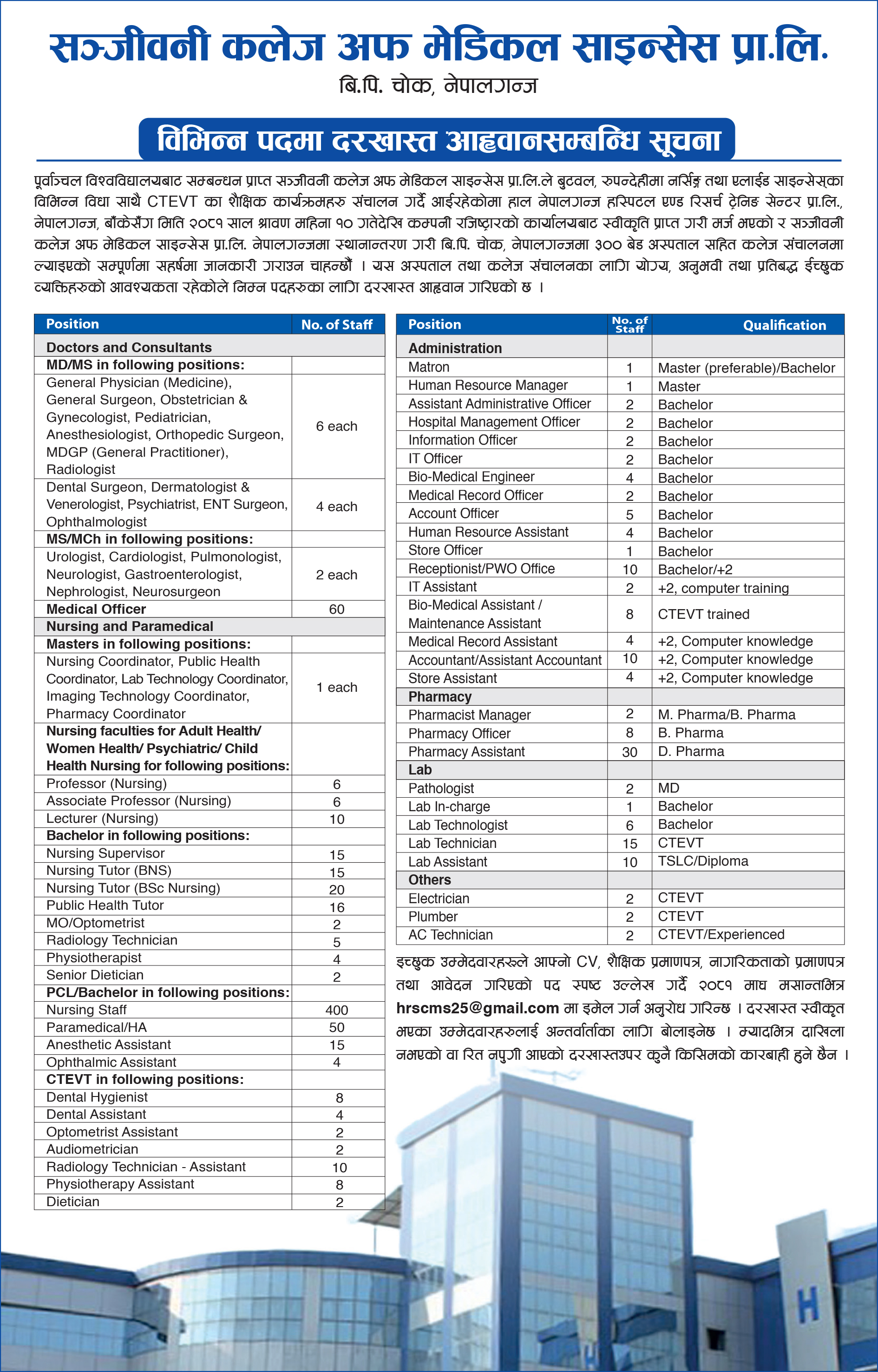 नेपालगञ्जमा रहेको सञ्जीवनी कलेज अफ मेडिकल साइन्सले विभिन्न पदमा ८२३ जना जनशक्ति माग गरेको छ।