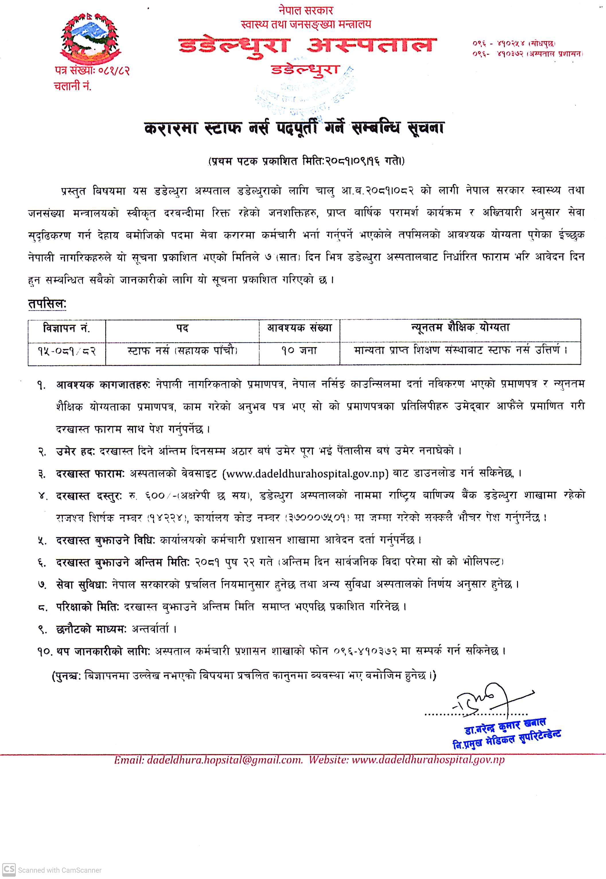 डडेल्धुरा अस्पतालमा १० जना स्टाफ नर्स आवश्यकता