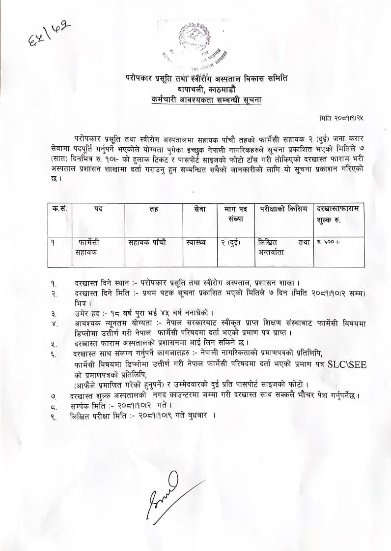 Vacancy Announcement at Paropakar Maternity and Women's Hospital