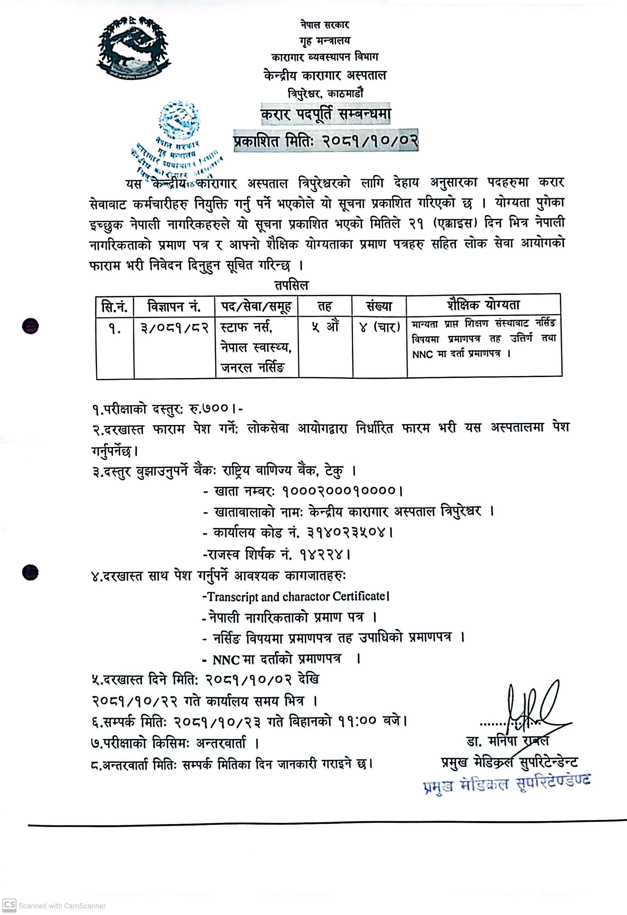 केन्द्रीय कारागार अस्पतालमा स्टाफ नर्स आवश्यकता सम्बन्धी सूचना