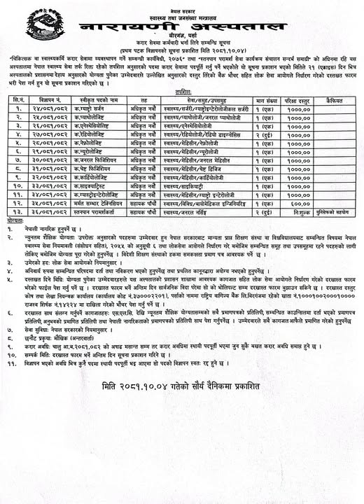 नारायणी अस्पतालमा सेवामा कर्मचारी आवश्यकता सम्बन्धी सूचना !