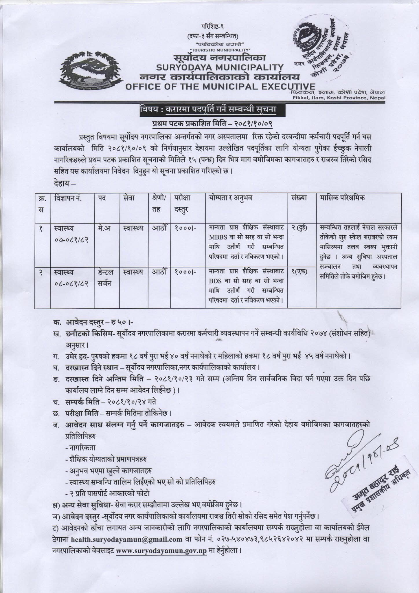 सूर्योदय नगरपालिकामा कर्मचारी आवश्यकता सम्बन्धी सूचना