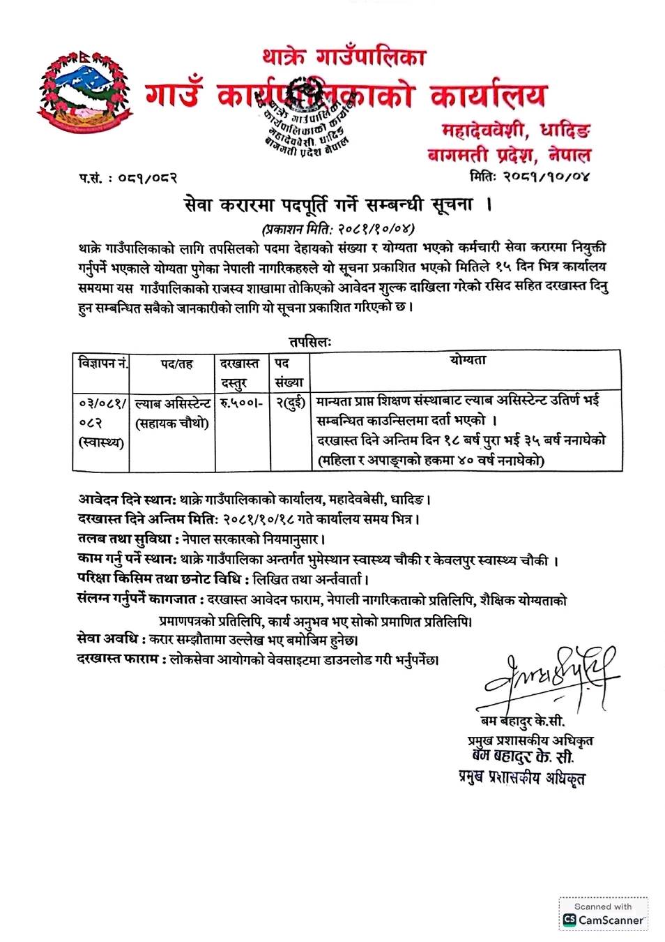 थाक्रे गाउँपालिका धादिङमा ल्याव असिष्टेण्ट आवश्यकता सम्बन्धी सूचना