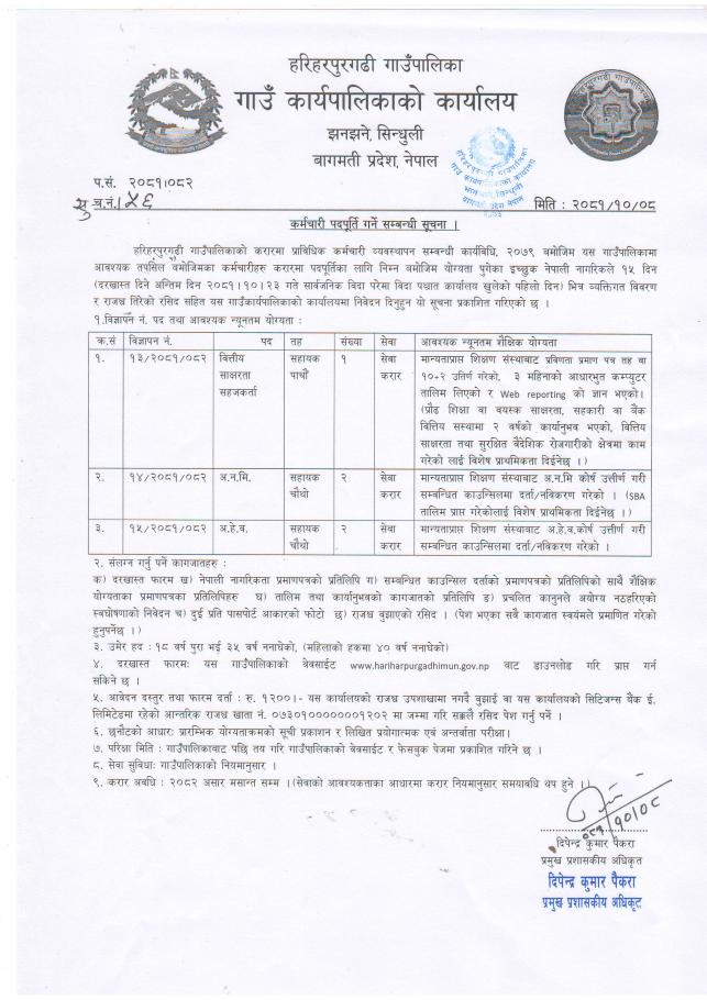 हरिहरपुरगढी गाउँपालिका सिन्धुलीमा AHW, ANM आवश्यकता