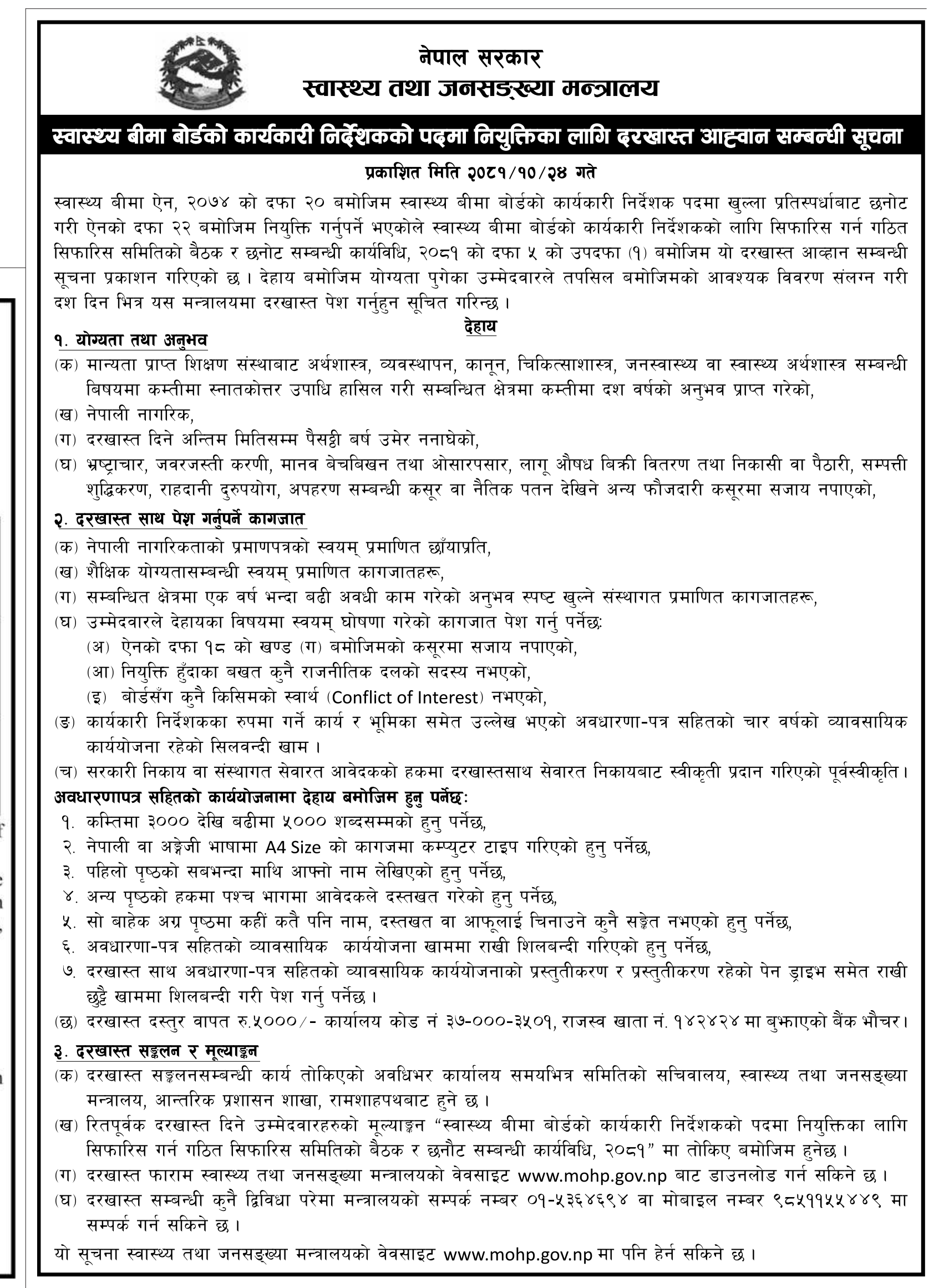 स्वास्थ्य बीमा बोर्डको कार्यकारी निर्देशकको पदमा नियुक्तिका लागि दरखास्त आह्वान सम्बन्धी सूचना
