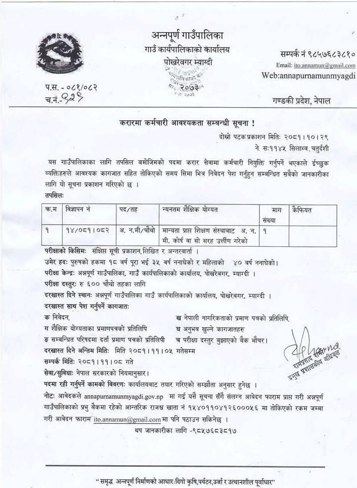 अन्नपूर्ण गाउँपालिका म्याग्दीमा अ.न.मी. आवश्यकता सम्बन्धी सूचना