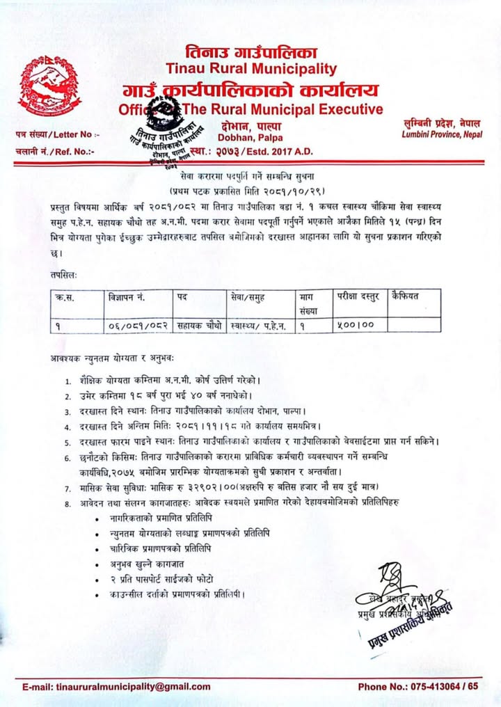 तिनाउ गाउँपालिका पाल्पामा अ.न.मी. आवश्यकता