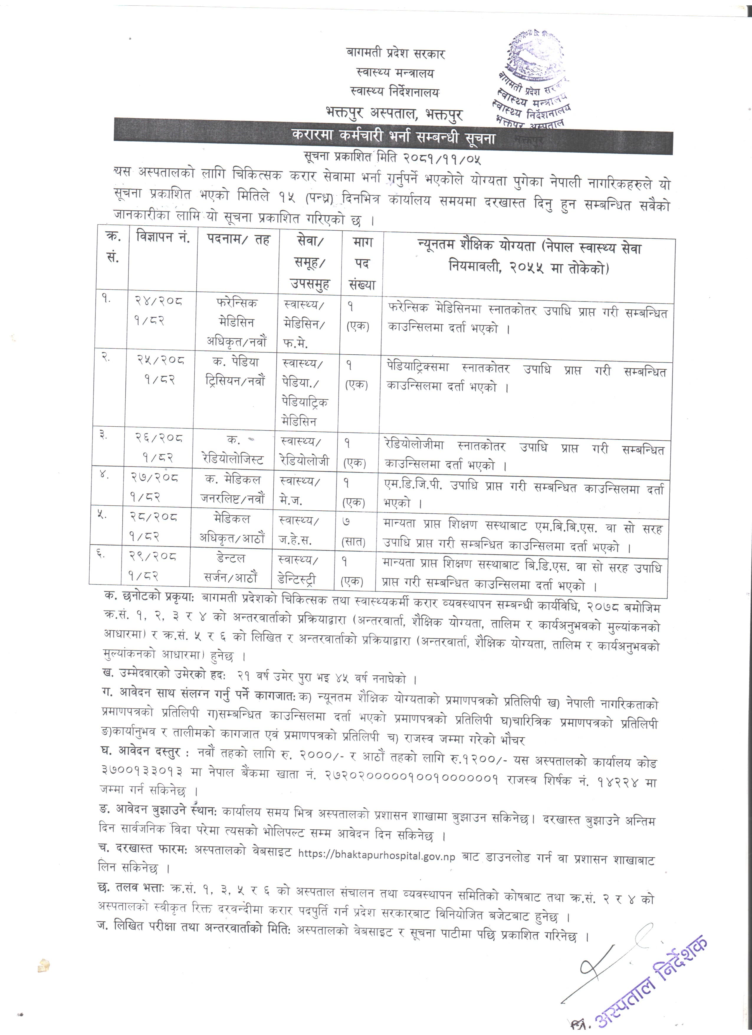 भक्तपुर अस्पतालमा करार सेवामा कर्मचारी आवश्यकता सम्बन्धी सूचना
